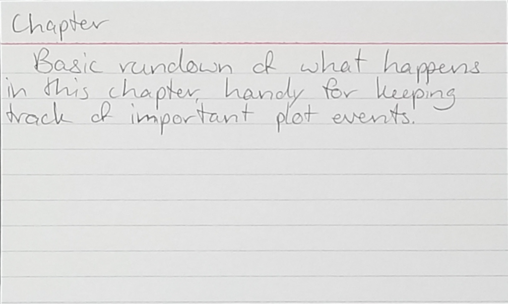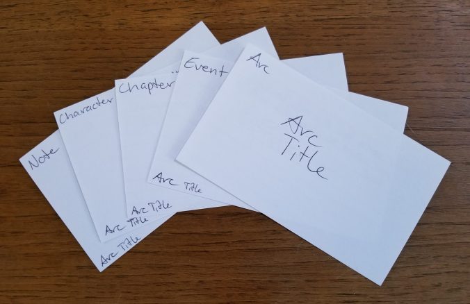 I also suggest keeping a writing journal where you can keep more long-form descriptions of planned arcs, events, and such so you can keep the information on the backs of the cards concise and avoid losing anything as time passes. The flash cards are also a good accompaniment in that they can be used to quickly reference the highlights of previous chapters instead of having to spend time flipping through your writing journal.